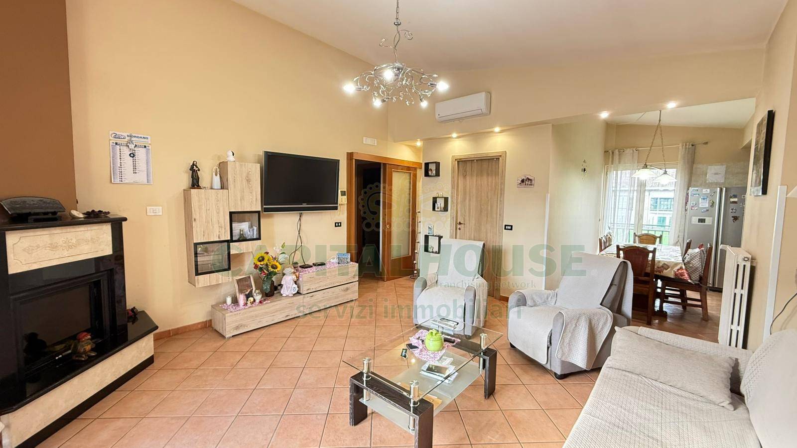 Il salone ampio e luminoso, climatizzato, con termocamino, è lo spazio perfetto per rilassarsi dopo una lunga giornata o per condividere momenti speciali con famiglia e amici.